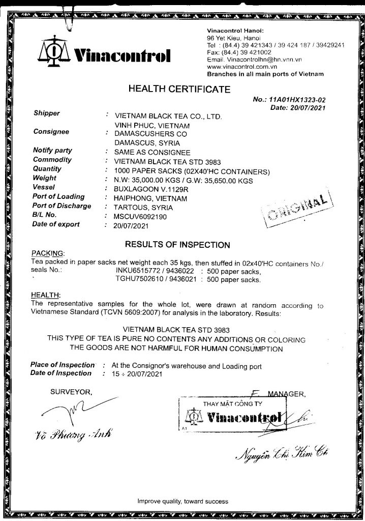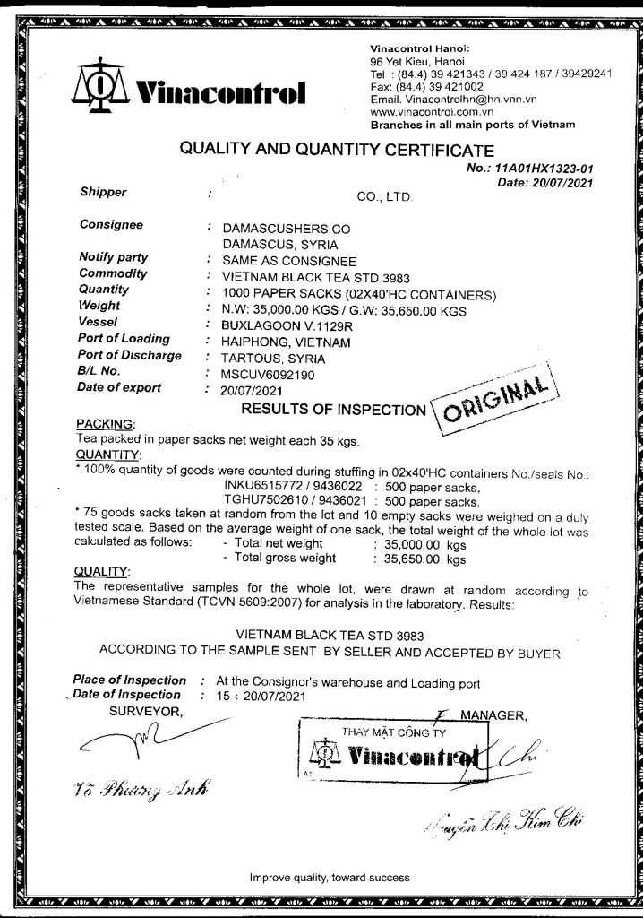 Giấy chứng nhận số lượng, chất lượng/ Quality and Quantity Certification