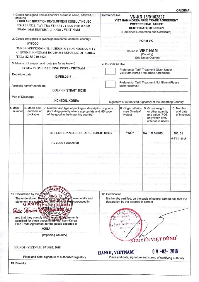Nội dung kê khai C/ O form VK cụ thể như sau: